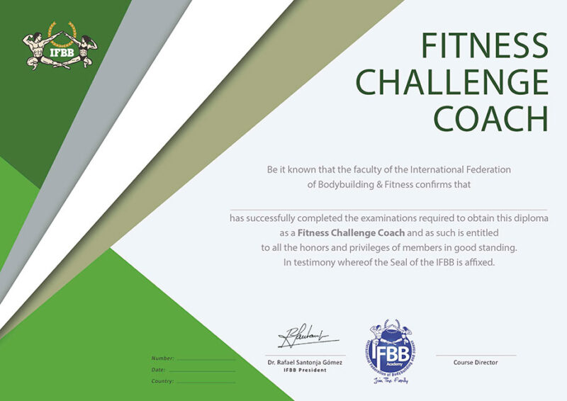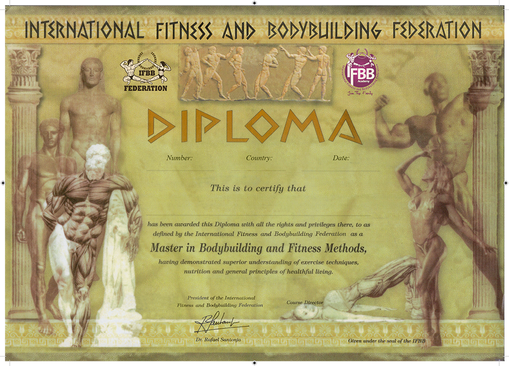 The certification you will be sent once you have completed all the required activities in the course is an IFBB international certification and a Master Fitness Coach and Cross Degree card.