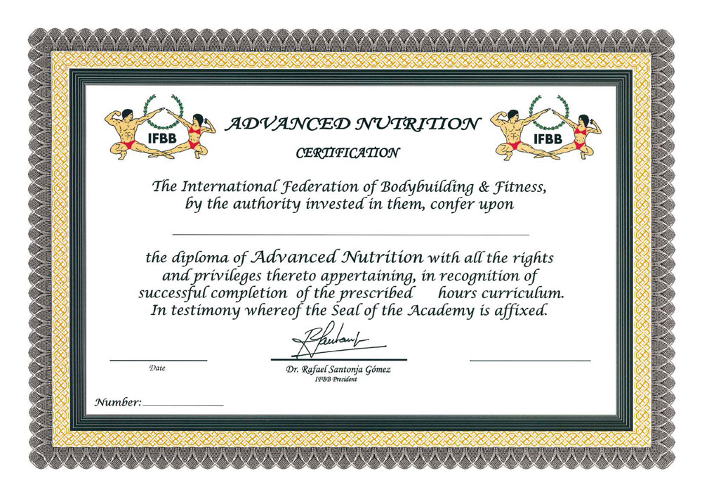 The IFBB Advanced Nutrition course provides the student with a high knowledge of nutrition, diet and supplementation in Fitness and bodybuilding as an essential tool to help the client obtain the best results. The student will obtain the necessary information to carry out personalized diets and supplementation plans as well as an exhaustive knowledge of the most current nutritional supplements on the market and their scientific bases in terms of effectiveness, dosage and results.